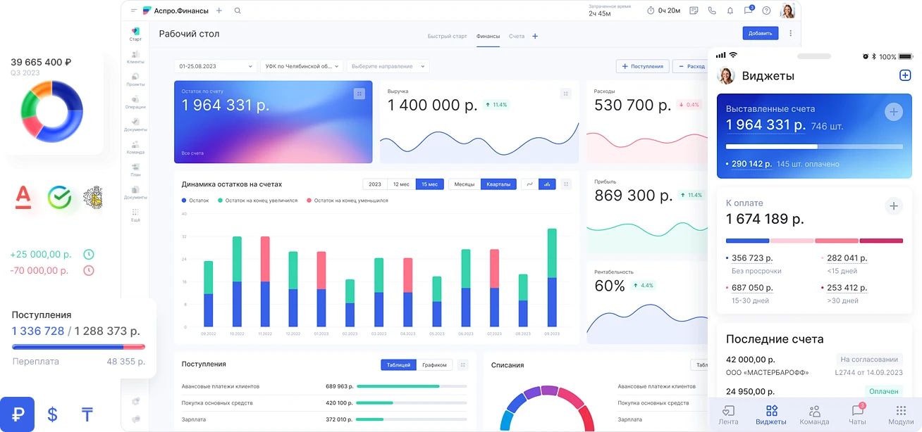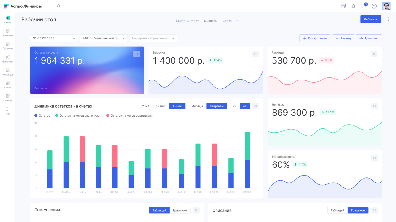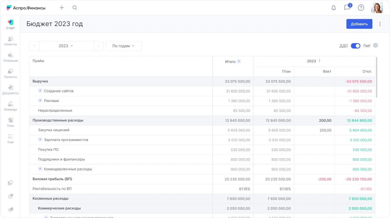 Аспро.Финансы — универсальная система финансового учета для бизнеса любого размера. В платформе есть все необходимые инструменты: отчеты ДДС и ПиУ, модуль бюджетирования и платежный календарь.