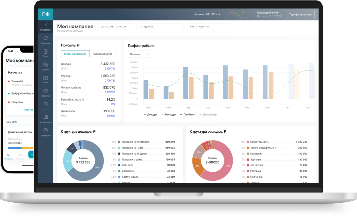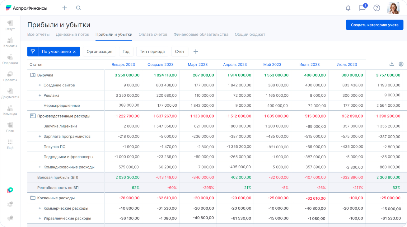 Система финучета позволяет подробно разделять доходы и расходы, чтобы получать точные отчеты по конкретным направлениям — например, отслеживать все затраты на закупку сырья.