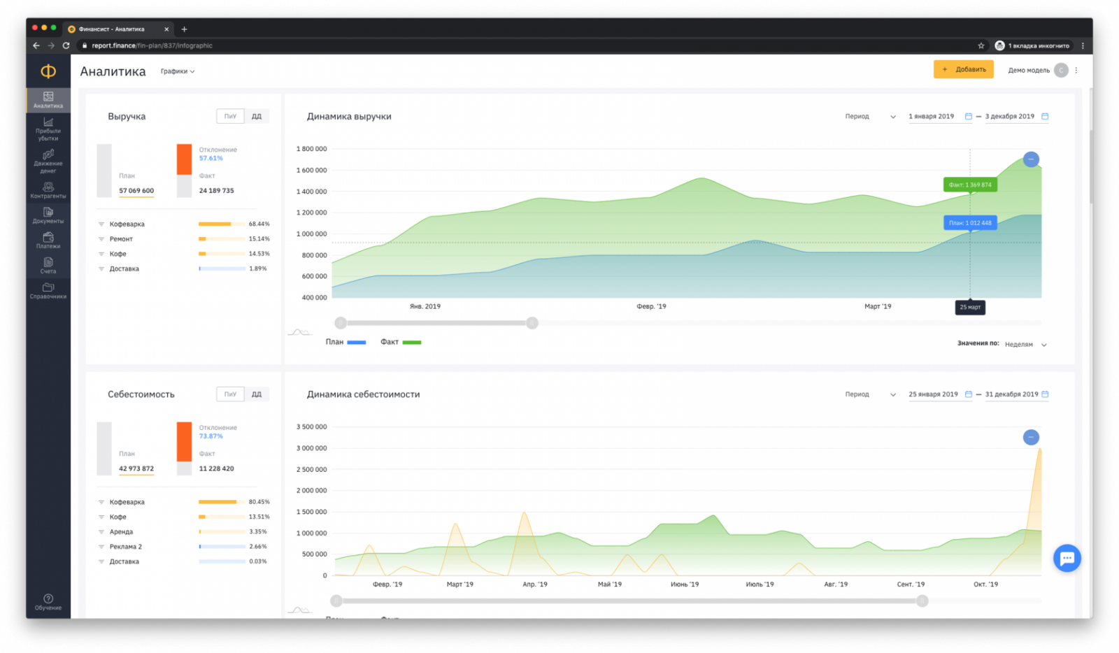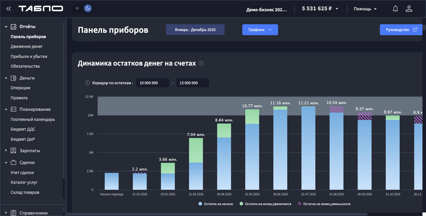 Финансист — профессиональный сервис управленческого учета, который рассчитан на работу с более крупными компаниями. Есть финансовые отчеты, платежный календарь и дашборды.