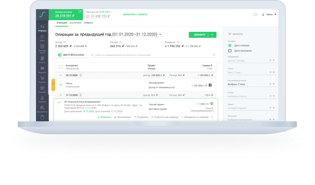 Программа для управленческого учета Seeneco позволяет контролировать движение денежных средств, а также планировать доходы и расходы. Сервис хорошо подходит для малого бизнеса, так как не требует сложной настройки.