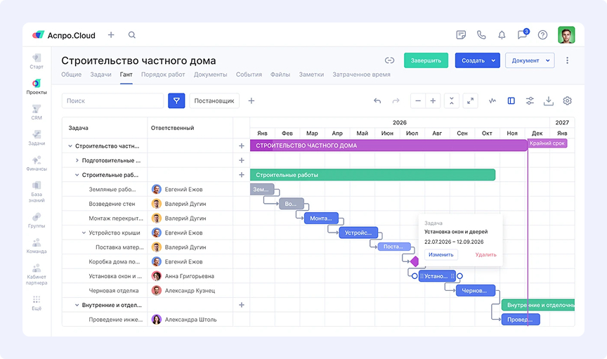 Держите все стороны проекта под контролем в Аспро.Cloud: используйте диаграмму Ганта, готовые шаблоны и инструменты бюджетирования. Управляйте сроками, ресурсами, бюджетом и командой: от планирования до реализации.