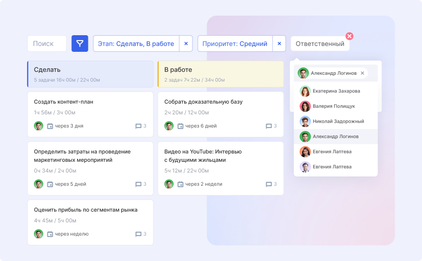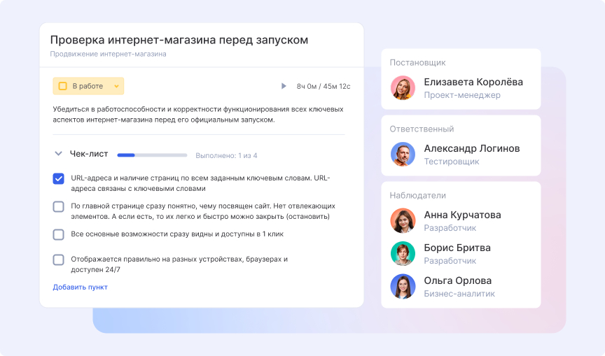 Роли для каждой задачи можно назначить в системе управления проектами Аспро.Cloud. Для этого необходимо создать проект, добавить команду и определить задачи.