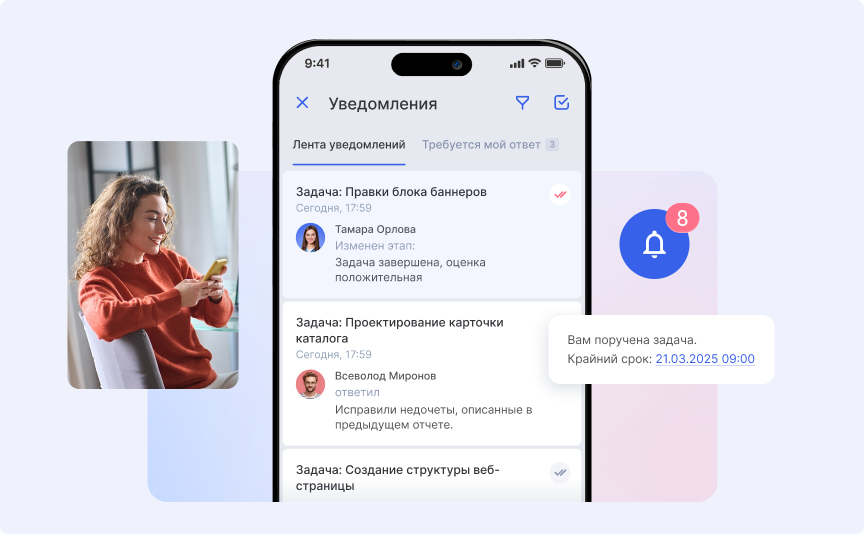 Все изменения в задачах и ролях система сообщает автоматически. Вам не придется писать каждому сотруднику лично. Участники проекта вовремя узнают о любых изменениях: