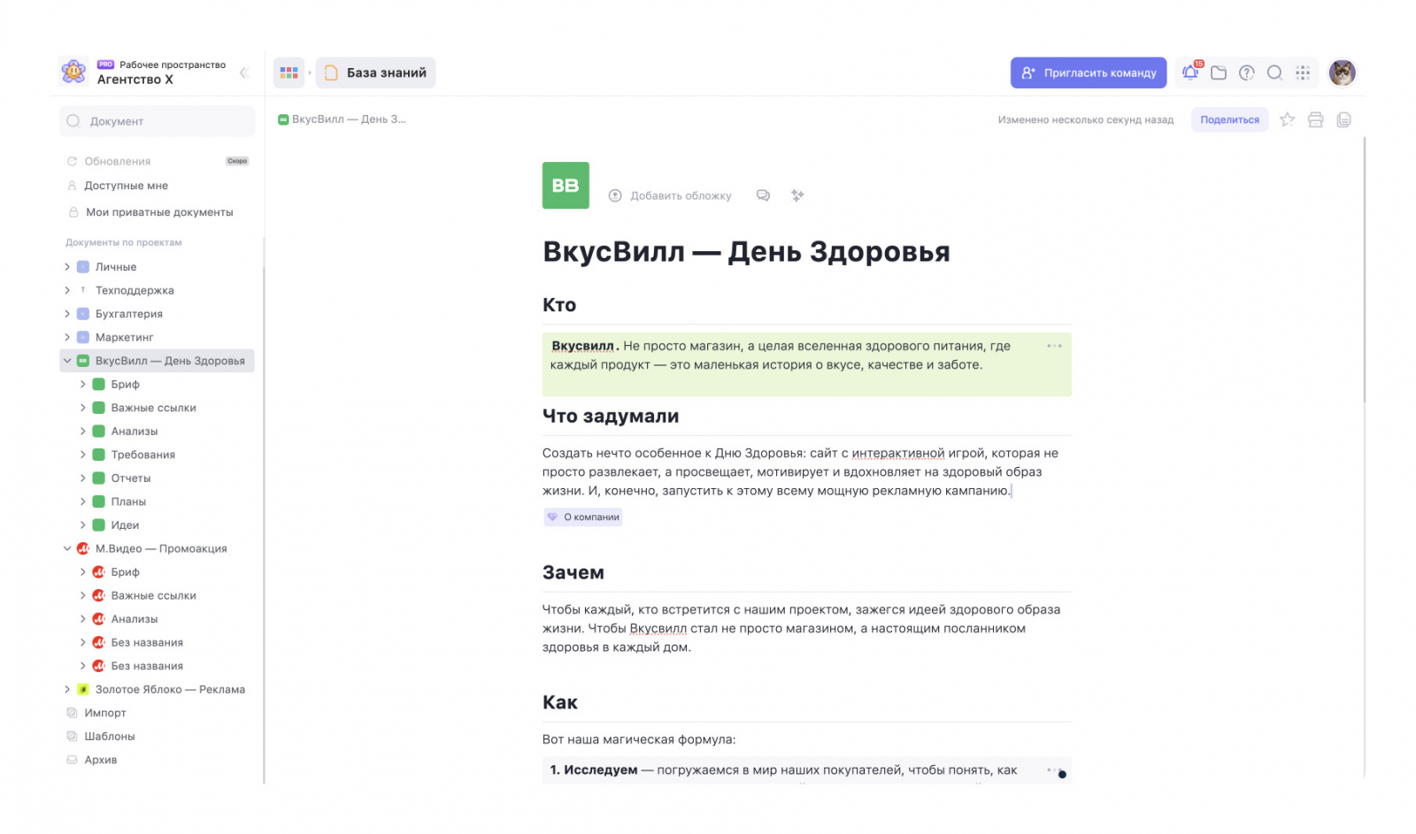 - Рабочие пространства. Разделяйте материалы по направлениям и командам для упрощения поиска.