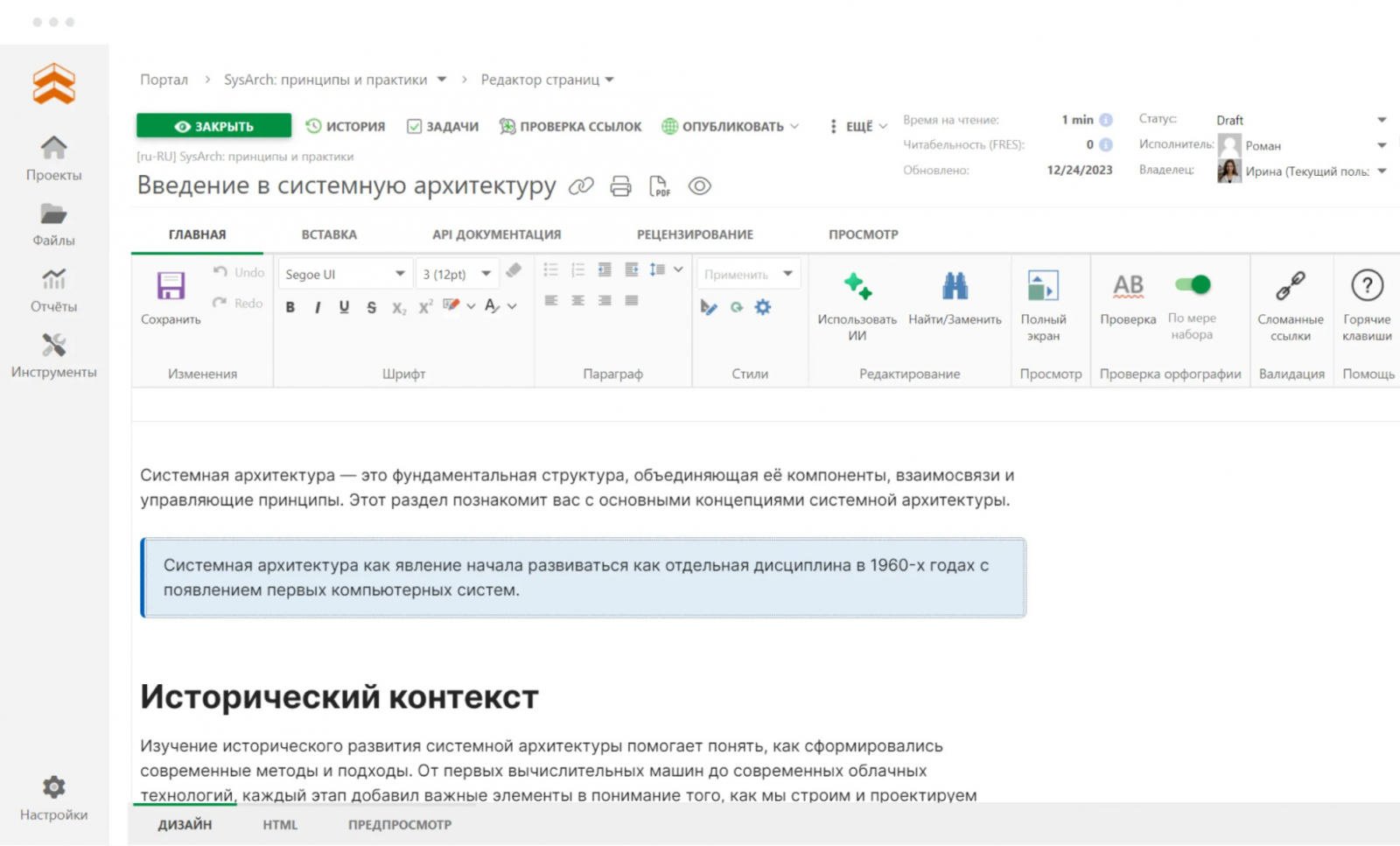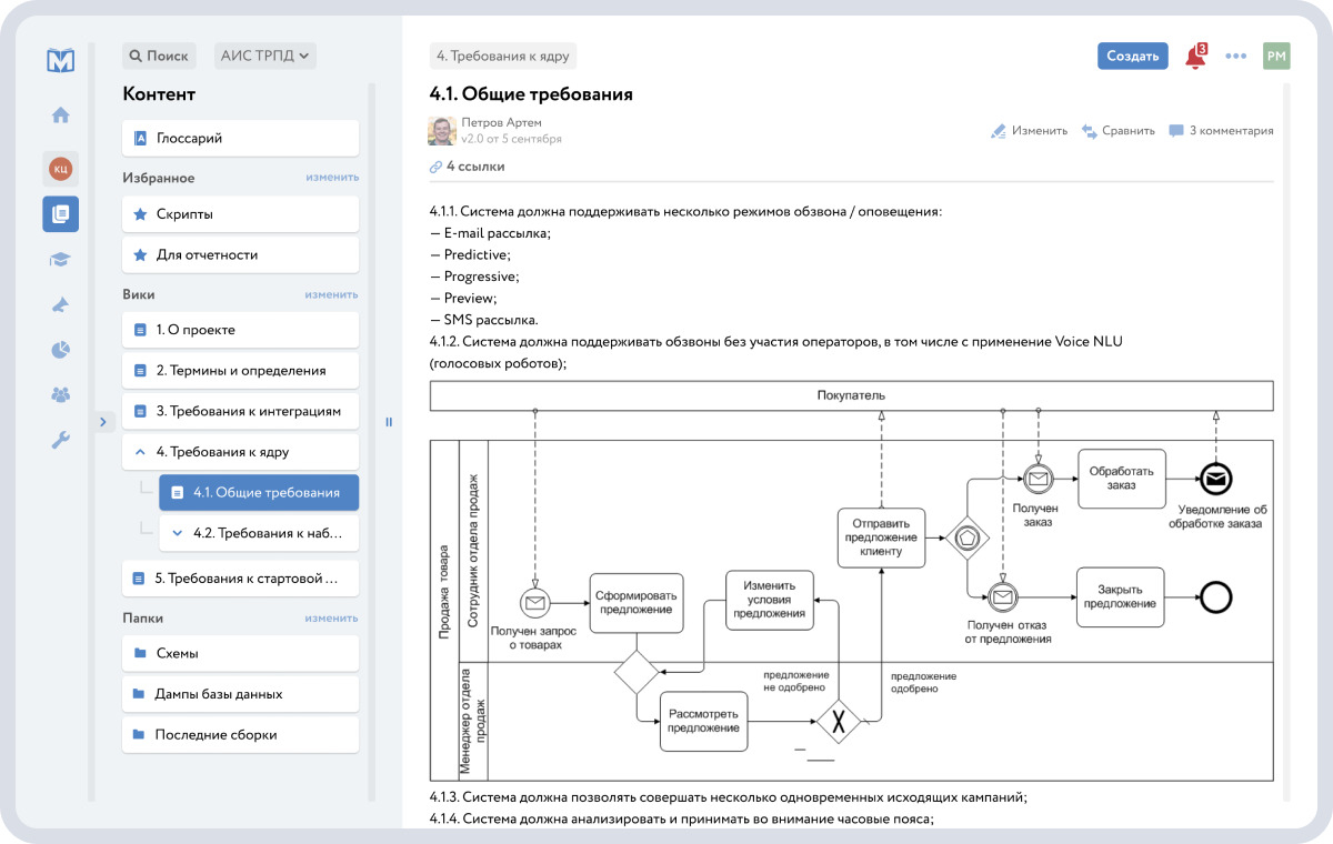 - Совместная работа. Обсуждайте материал с коллегами прямо в системе, вносите правки и давайте обратную связь.
