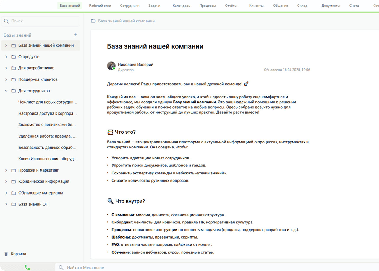- Интеграция с рабочими процессами. Связывайте статьи с задачами и сделками в CRM, чтобы сотрудники мгновенно получали необходимые инструкции и информацию прямо в контексте своей работы.