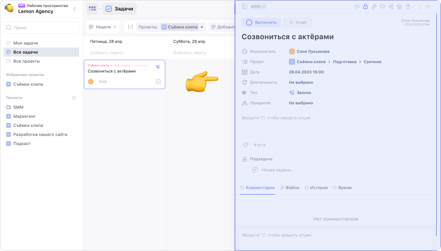 - Карточка задачи. Каждая задача имеет свою карточку, в которой отображены все ключевые данные: название, приоритет, сроки, исполнитель и этап работы. К задачам можно добавлять подзадачи, прикреплять файлы, оставлять комментарии и ссылки. Это делает работу над задачей прозрачной и упрощает коммуникацию внутри команды.