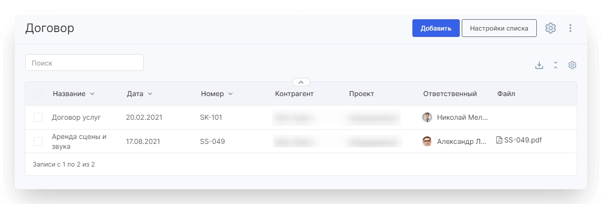Для упрощения документооборота был создан пользовательский список для учета договоров. Один договор можно связать сразу с клиентом и проектом.