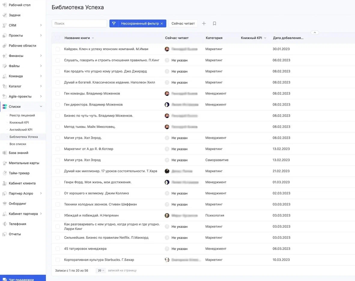 Для управления корпоративной библиотекой компания использует модуль «Списки». Система отслеживает: