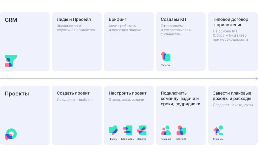 Теперь менеджеры проектов и исполнители подключаются к работе с клиентом уже на этапе брифинга, совместно ведя его по воронке продаж.