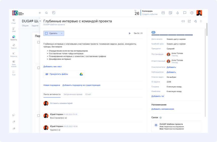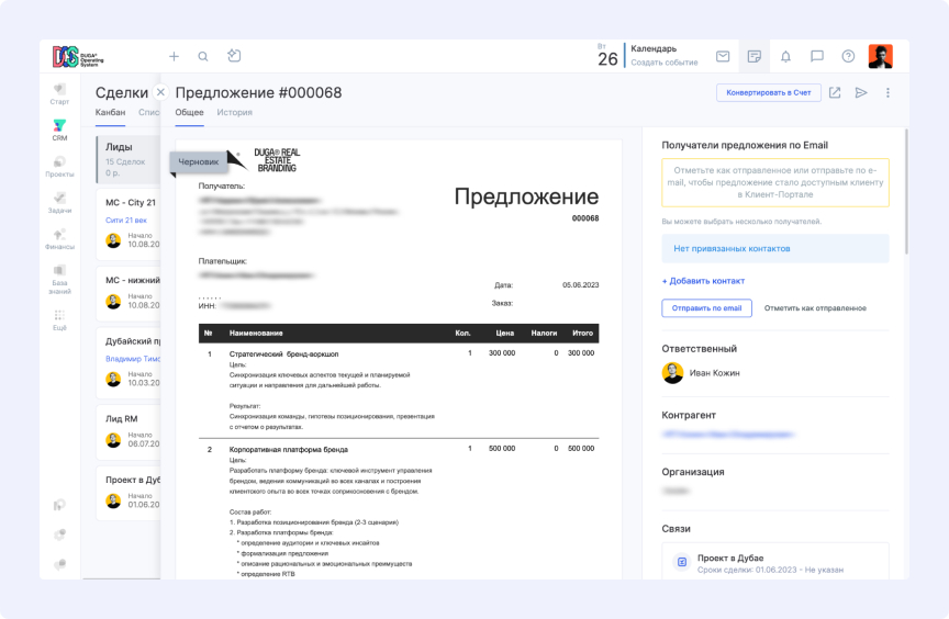 «Из-за большого количества инструментов рабочий процесс был запутанным. Например, в amoCRM мы что-то продали, потом это куда-то потерялось. В Asana уже ведем проект, а цифры вообще в таблицах. Такая разрозненность не давала увидеть полную картину бизнеса», — рассказывает Юрий Нарвин, владелец и CEO брендингового агентства DUGA®.