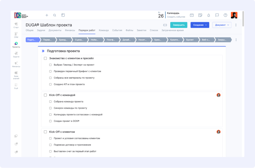 В системе создан шаблон типового проекта с четко прописанными этапами, вехами и задачами.