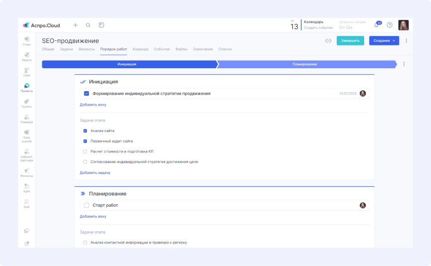 Решение: Внедрение модуля «Проекты» с созданием типовых шаблонов для каждого вида услуг. Шаблоны включают полную последовательность работ с четкими этапами выполнения. Запуск нового проекта осуществляется в один клик.