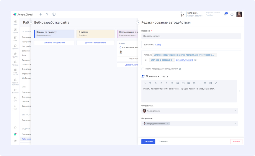 Решение: Настройка автодействий для каждого этапа проектов. При завершении задачи система автоматически уведомляет следующего ответственного специалиста.