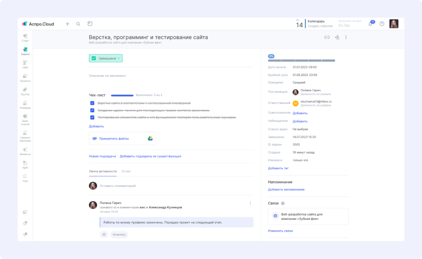 Практический пример: после завершения верстки и программирования сайта специалист Анна переводит задачу в статус «Завершено». Система немедленно уведомляет Александра о готовности к началу этапа наполнения и релиза.