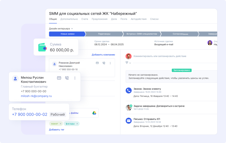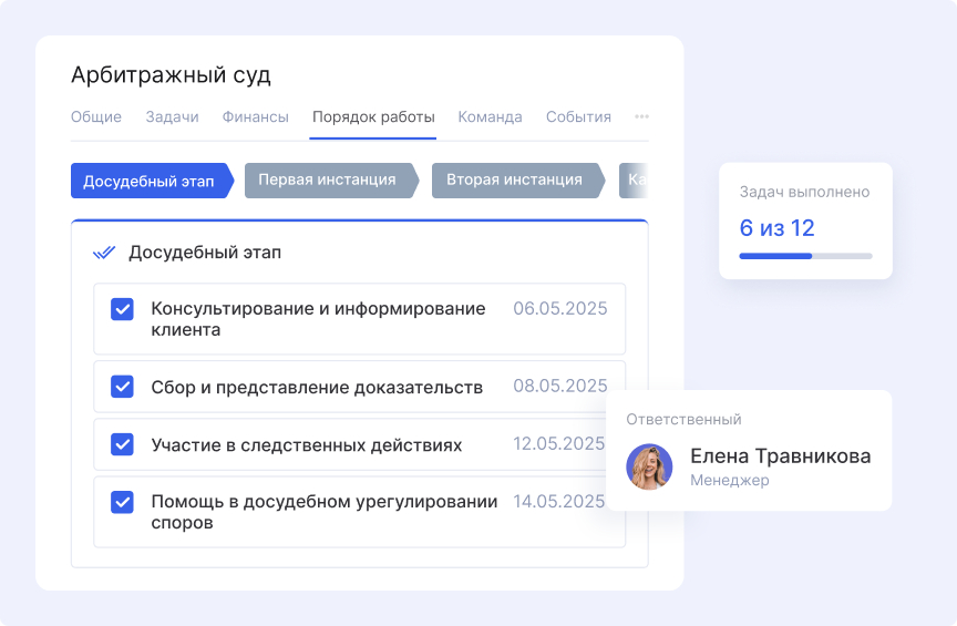 Особенность юридических проектов в том, что карточка сделки может несколько раз перемещаться между этапами «Исполнение» и «Документы». Это связано с тем, что в рамках одного договора часто оказывается комплекс услуг: консультация, подготовка досудебной претензии, подача иска и сопровождение в суде.