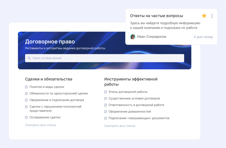 Команда активно развивает внутреннюю базу знаний, пополняя ее полезными материалами: данными о завершенных делах, анализом успешных и неудачных кейсов, шаблонами договоров и актуальной законодательной базой.