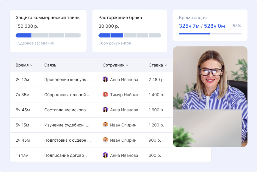 Особенно важным был последний пункт — контроль времени, затрачиваемого на каждое дело, необходим для корректного планирования и ценообразования юридических услуг.