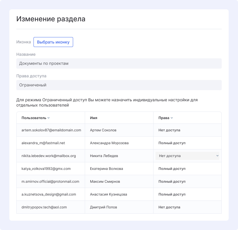 Модуль «Файлы» в Аспро.Cloud стал центральным хранилищем всех материалов по делам. Система папок и разделов позволяет структурировать документы, а настройки доступа — обеспечить конфиденциальность.