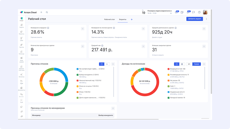 Мониторинг показателей обеспечивает CRM-система. Например, Аспро.Cloud автоматически агрегирует данные и создает наглядные дашборды.