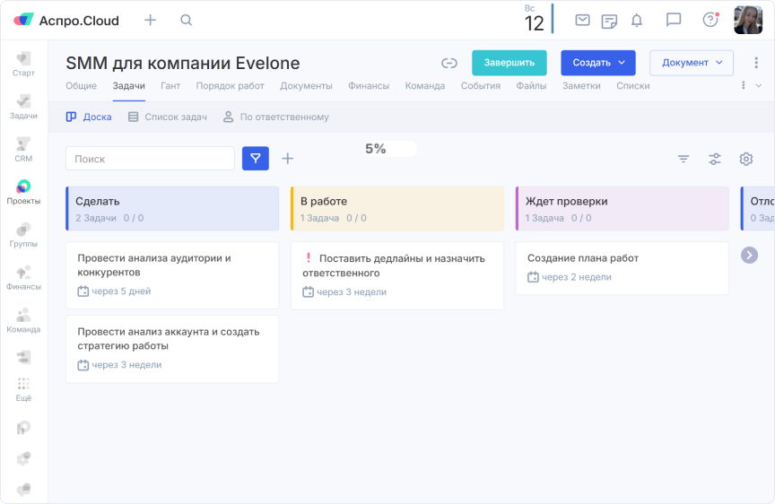 Ежемесячно агентство ведет десятки проектов. Аспро.Cloud помогает держать контроль. У каждого проекта есть карточка, где хранится вся информация: требования, бюджет, задачи, сроки и ответственные.
