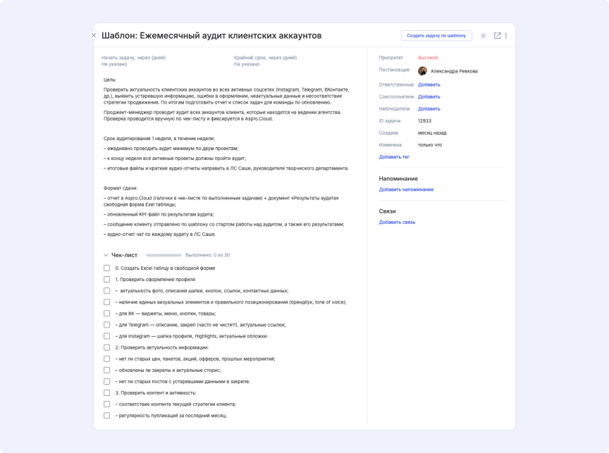 У агентства есть задачи, которые повторяются регулярно, например подготовка еженедельной отчетности. Создавать их вручную каждый раз — трата времени. В этом помогают регулярные задачи.