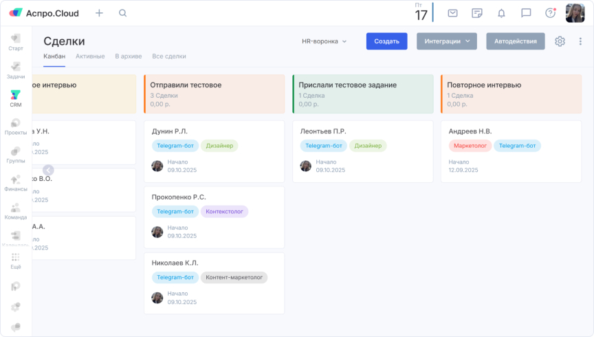 «Кандидат отправляет заявку через Telegram-бота — мы сразу получаем оповещение в CRM и начинаем работу. Сначала выбираем профессию, потом отмечаем источник привлечения для анализа эффективности. Все этапы теперь сосредоточены в одной системе — никаких внешних платформ», — рассказывает Иван.