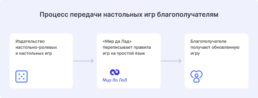 Одно из направлений «Мир да Лад» связано с адаптацией настольных и настольно-ролевых игр. Команда получает коробки от издательств, переводит правила на РЖЯ и передает готовые наборы благополучателям.