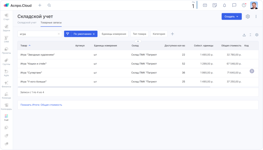 Для этого используют модуль «Складской учет». Сотрудники фиксируют каждое поступление игр в системе. В разделе «Товарные запасы» команда видит актуальные остатки.