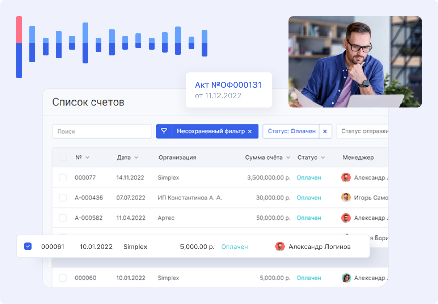 Счета формируют по завершенным этапам. Данные подтягиваются автоматически. Это снижает риск ошибок при ручном вводе. После закрытия сделки можно сразу выставить акт. Интеграция с банками позволяет фиксировать оплаты, формировать ПиУ и отслеживать ДДС.