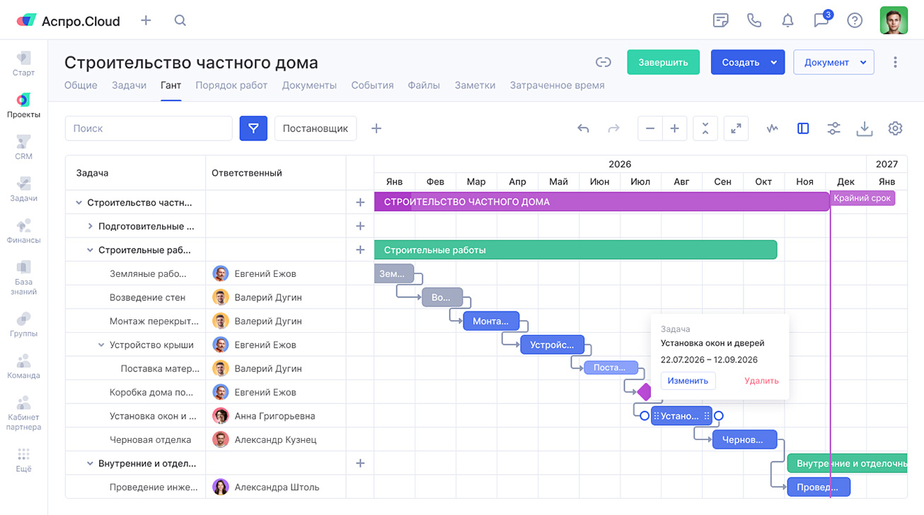 - Ускорить планирование. Встроенный редактор диаграммы Ганта позволяет создавать план проекта быстро и удобно. Меняйте даты, назначайте ответственных, добавляйте этапы и задачи, чтобы вся информация была на одной панели, без лишних переходов между вкладками.
