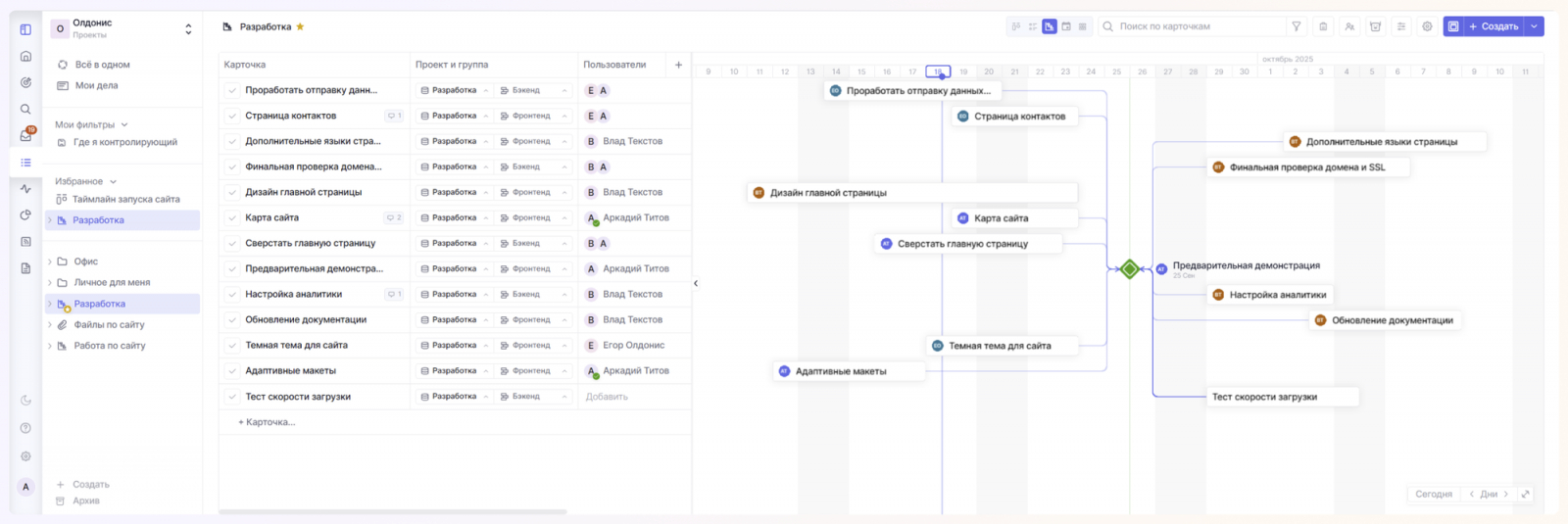 - Ускорить планирование. Меняйте даты перетаскиванием прямо на графике. Интерактивное управление таймлайном позволяет корректировать задачи без открытия каждой карточки отдельно.