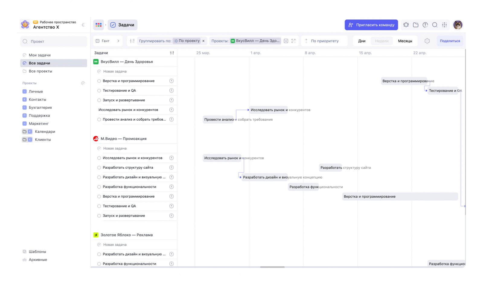 - Работать с задачами из одного пространства. На экране одновременно видна диаграмма с датами и список задач с приоритетом, статусом и исполнителем. Не нужно переключаться между вкладками.