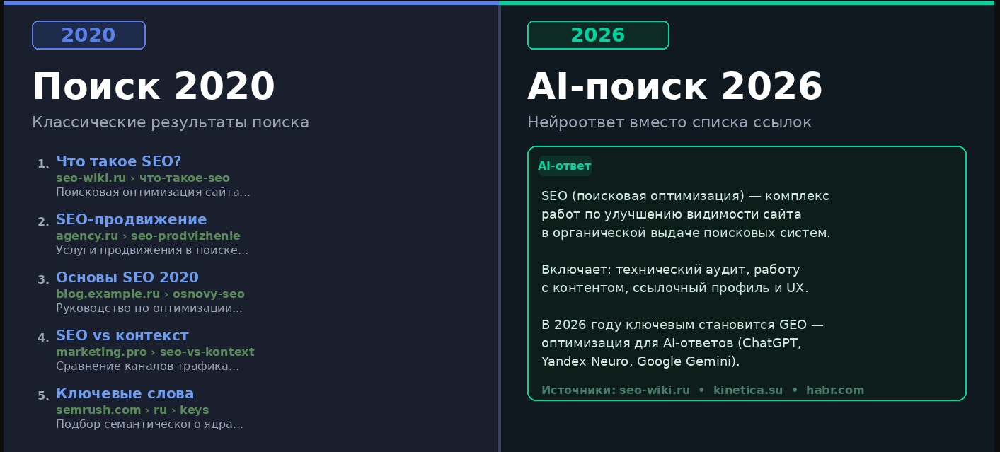 Теперь поисковая система не ведет пользователя на сайт — она сама отвечает на вопрос, синтезируя информацию из десятков источников. Побеждает не тот, кто выше в органической выдаче, а тот, чей контент попадает в нейроответ. Это принципиально другая игра с другими правилами.