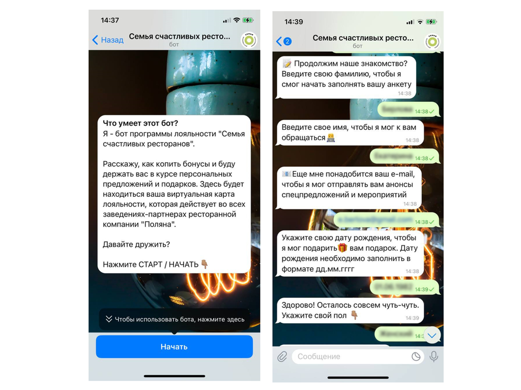 Если SMS-сообщения и email уже почти не используются людьми в обычной коммуникации (особенно если мы говорим о молодой активной аудитории) и воспринимаются исключительно как рекламные каналы, то отношения к мессенджерам гораздо лояльнее. Через Телеграм можно отправлять информацию о новинках, акциях, специальных предложениях и просто «напоминалки» о себе, если гость давно не появлялся в ресторане.