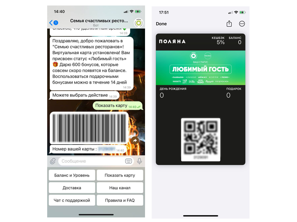 Сразу после регистрации в программе, бот выпускает карту лояльности и выдает штрих-код. Его можно показывать на кассе или при оплате официанту сразу из Телеграм – CRM-система «узнает» его при считывании, моментально сопоставит со своими данными и позволит начислить и списать бонусы или приобрести товар со скидкой (в зависимости от типа программы лояльности и предложений бренда).
