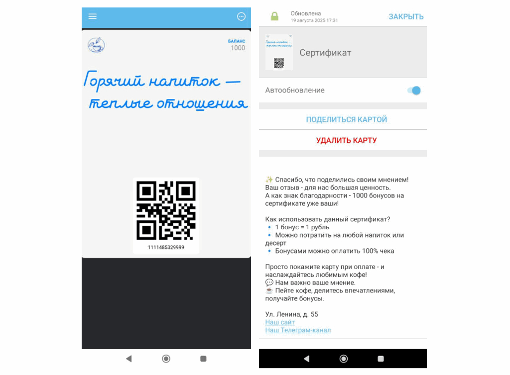 Сертификат - это дополнительная карта в приложении Wallet. Он подходит для дополнительной мотивации клиентов подарками и маркетинговыми акциями. Сертификат выдается клиенту с конкретной суммой, которую можно потратить целиком или частично, и работает как электронная подарочная карта, которую клиент может скачать в свой смартфон и использовать при оплате покупок на кассе.