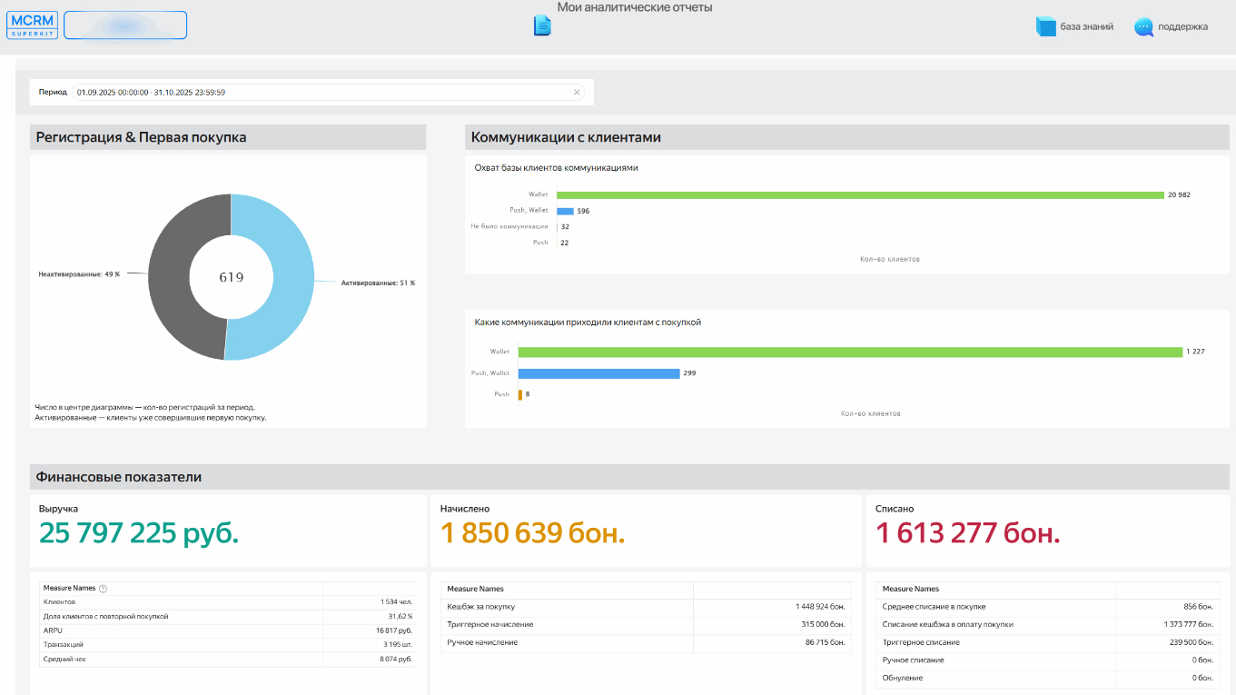 Понимание LTV (пожизненной ценности клиента), Retention Rate (удержания), ROI от маркетинговых кампаний помогает добиваться желаемых результатов. В MCRM есть встроенный кабинет аналитики, который помогает бизнесу понять, что именно хотят его клиенты, и как можно улучшить взаимодействие с ними.