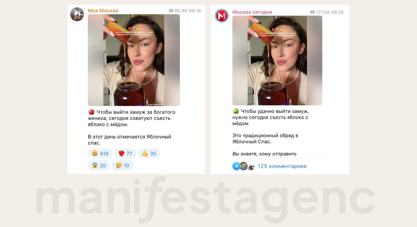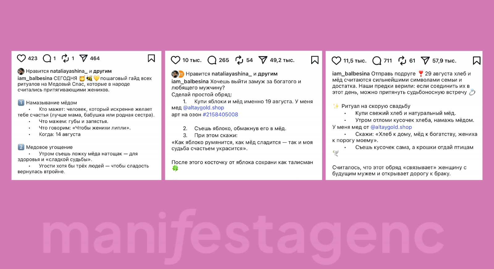 8,5 млн просмотров — мед и традиции реально зашли;100 000+ взаимодействий — комментарии, сохранения, истории, вовлечение;58 000+ пересылок — люди сами делились контентом;10 000+ комментариев — аудитория активно обсуждала ритуалы.