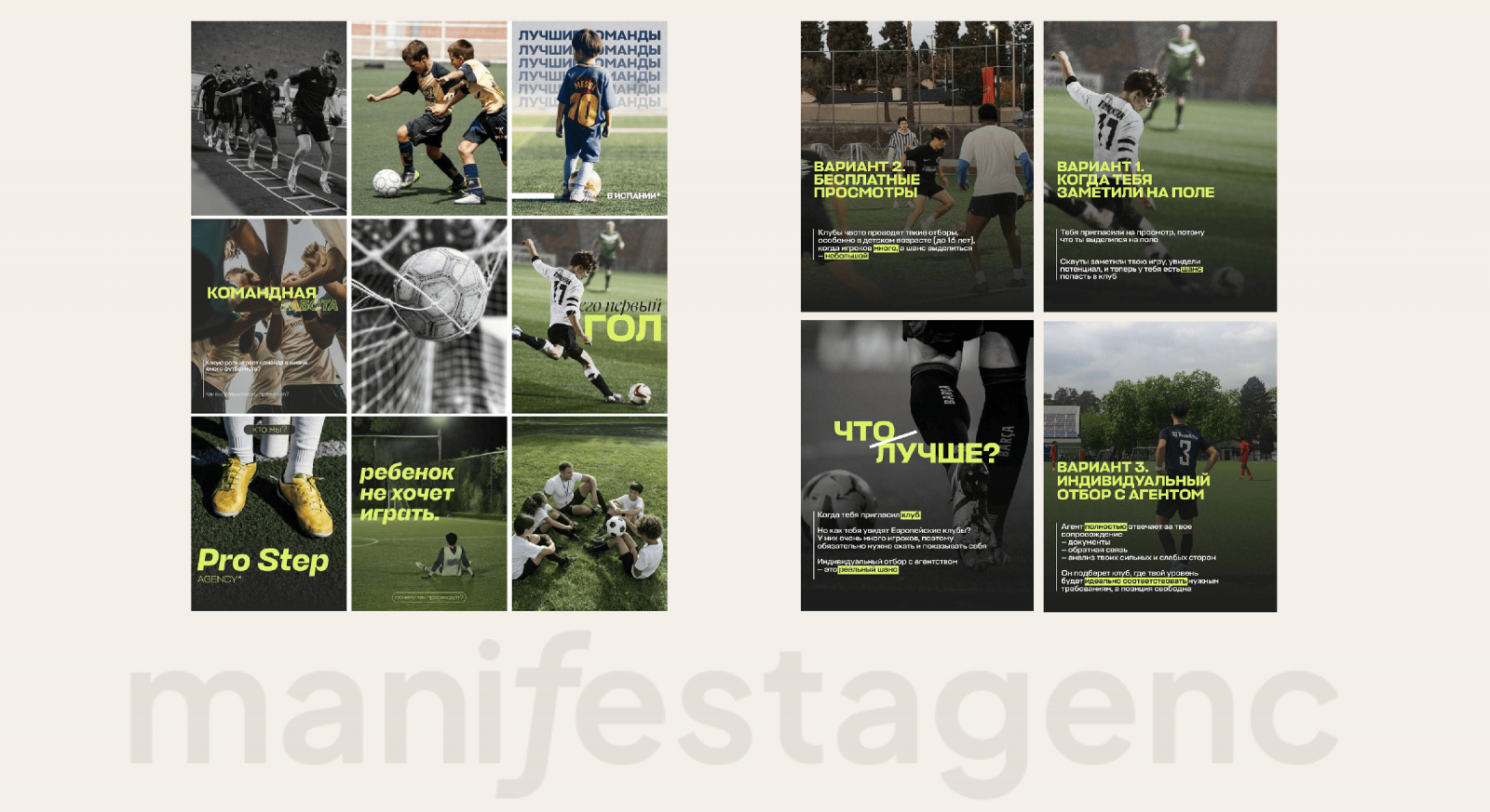 В июне к нам пришло футбольное агентство ProStep. Компания только выходила на рынок. Им было важно быстро стартовать и создать запоминающуюся айдентику. Снимать контент особо было некому, поэтому перед нами стоял настоящий челлендж — создать живой, эмоциональный аккаунт с нуля и максимально быстро выстрелить — каждый, кто когда-либо создавал инстаграм-аккаунт* для бизнеса, понимает 😅