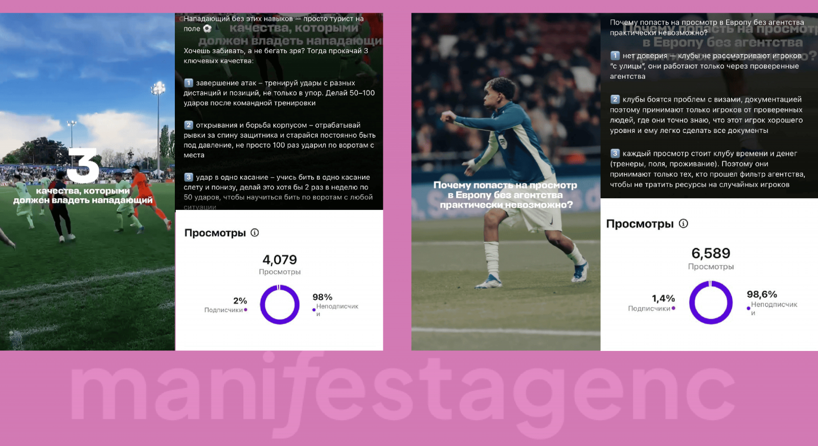 Главный секрет успеха — правильно подобрать форматы. Не все подойдут для футбольного агентства: видеокружки, распаковки и обзоры тут не работают.