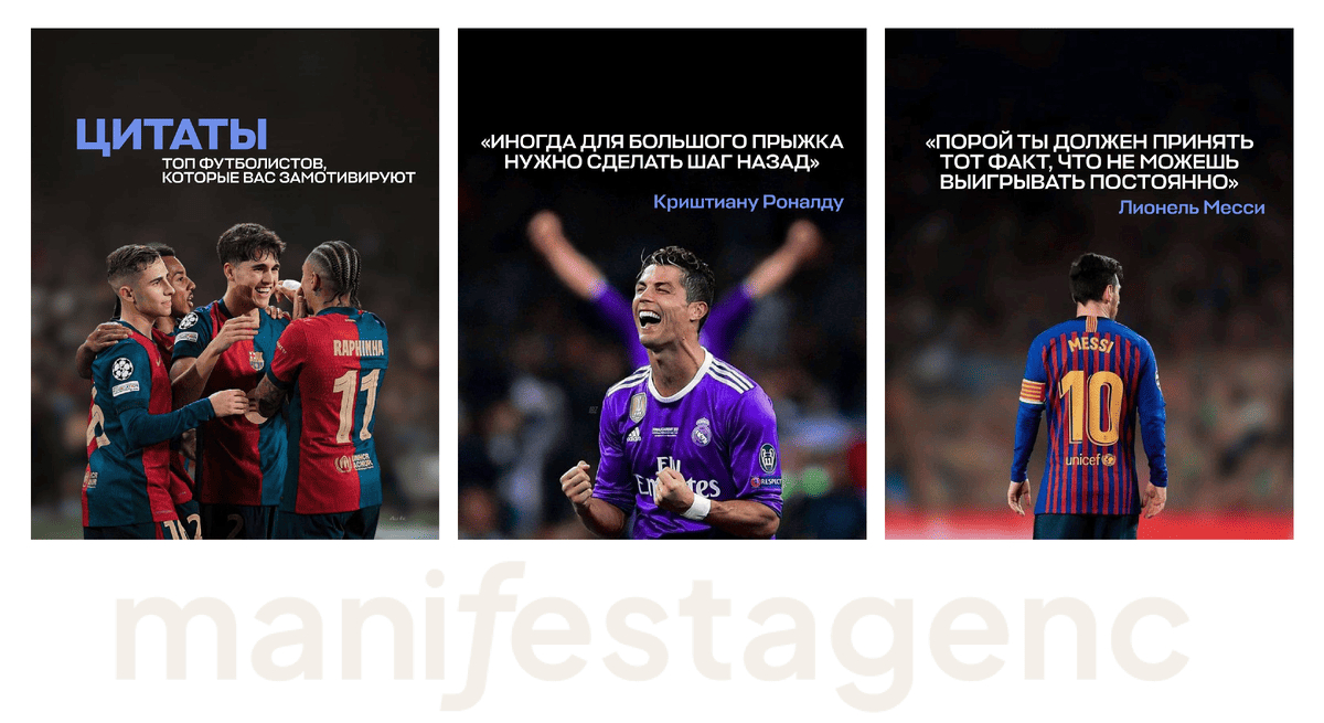 4) Раскрывали инсайты индустрии: почему бесплатные просмотры дают маленький шанс, а агент помогает реально попасть.5) Добавляли визуальные фишки: фотки культовых футболистов (Месси, Роналду, Пеле, Анри, Пуйоль) для авторитетности, текст на затемненном фоне, легко считывается.