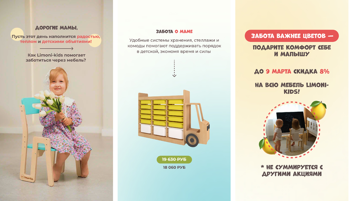В самом начале контент для LIMONI-KIDS был направлен на широкий охват и установление экспертизы в области методики Марии Монтессори. Мы начали с того, чтобы подробно объяснить, что делает мебель LIMONI-KIDS уникальной, и как она помогает в развитии ребенка. На этом этапе мы использовали экспертные статьи, исследования и рассказы о методике, чтобы заинтересовать целевую аудиторию.