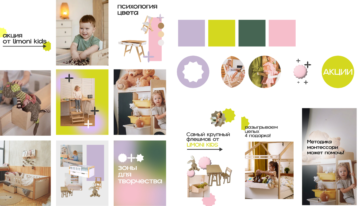 Изначально, когда мы приступили к разработке визуального стиля для бренда Limoni-Kids, мы выбрали один вариант оформления, который включал мягкие цвета, которые ассоциируются с детской мебелью и создают спокойную атмосферу. В этом варианте мы использовали пастельные оттенки розового, голубого и желтого, что придавало дизайну легкость и мягкость.
