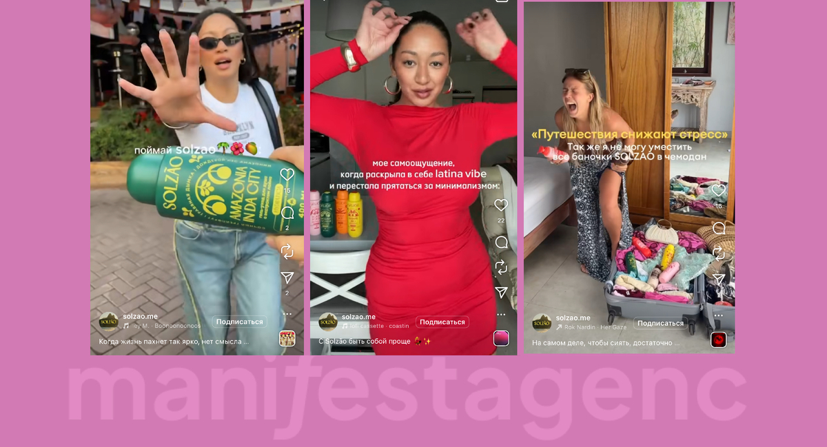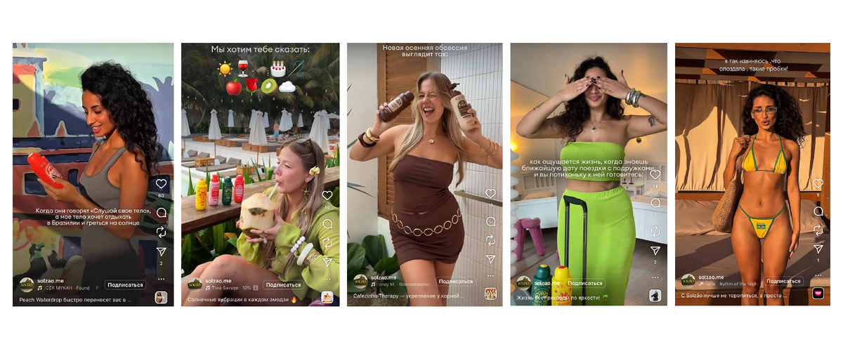 Важно: UGC-контент — это не просто видео от пользователей, а расширение ДНК бренда через реальные лица. Заряженные солнышком ролики от креаторов не только полюбились аудитории, но и органично вписались в общую атмосферу SOLZÃO. Именно поэтому мы работаем с креаторами, как с продакшеном: подбираем, тестируем, направляем, чтобы каждая единица контента попадала в эстетику бренда и вызывала эмоцию.