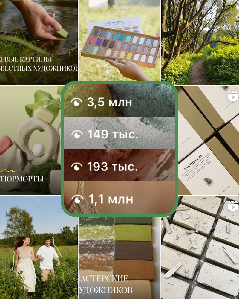 Мы построили живую, вдохновляющую, образовательную контент-стратегию, в которой бренд не просто показывал продукт, а рассказывал о вдохновении и смыслах, связанных с искусством.Контент стал пространством, где художники, дизайнеры и просто любители красоты находят не только материал, но и настроение. Earthberry не продавал пастель — он рассказывал про искусство, людей и оттенки.