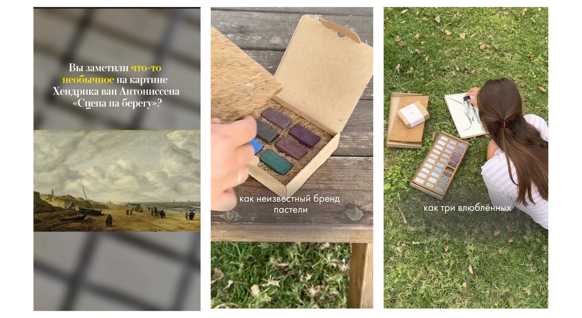 2. Истории и документальность.Короткие рассказы о людях, которые стоят за брендом:как создается пастель, кто делает упаковку, где родился первый цвет.3. Познавательные и культурные форматы.Видео-истории про художников, картины, природные явления.Формат интеллектуальных рилс — когда человек смотрит 15 секунди уходит чуть умнее и вдохновеннее.