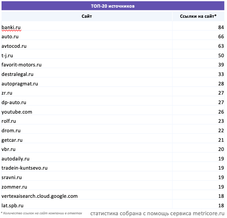 В ТОП источников попали в первую очередь крупные потребительские и финансовые площадки, маркетплейсы авто и медиа: banki.ru (84 ссылки), auto.ru (66), avtodoc.ru (63), t-j.ru (50). Дальше идут нишевые экспертные ресурсы про юридические риски и диагностику (destralegal.ru, autopragmat.ru), а также автомобильные медиа (zr.ru, autodaily.ru) и платформы с объявлениями (drom.ru). Сайты самих автодилеров присутствуют, но заметно слабее: favorit-motors.ru (39), rolf.ru (23), tradein-kuntsevo.ru (19) - ИИ чаще опирается на внешние, условно независимые источники, чем на брендовые страницы.