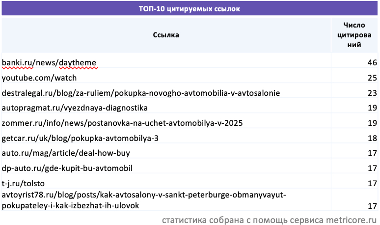 Самая цитируемая ссылка - тематическая лента banki.ru (46 цитирований). В ТОП также попали YouTube (25) и статьи-памятки про покупку авто и риски в автосалоне (destralegal.ru - 23, auto.ru - 17, dp-auto.ru - 17, avtoryist78.ru - 17), плюс практичные материалы про диагностику и проверку (autopragmat.ru - 19) и про регуляторику (zommer.ru про постановку на учет в 2025 - 19). Общий паттерн такой: LLM любят контент, который закрывает страхи покупателя (обман, документы, юр чистота, проверка) и дает пошаговые инструкции - именно этот слой контента чаще всего становится "доказательной базой" для AI-ответов.