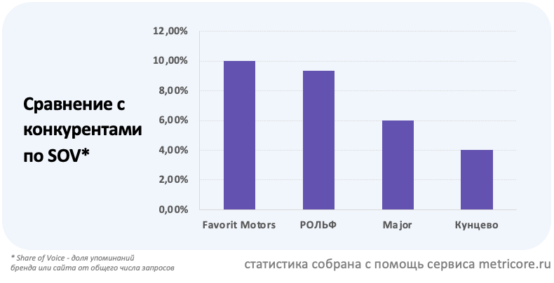 Рассмотрим на сколько полно представлены автосалоны в ответах ИИ. По SOV (доля ответов с упоминанием бренда или сайта компании) лидирует Favorit Motors - около 10% упоминаний среди выбранных брендов, затем идет РОЛЬФ - около 9%. Major заметно отстает (около 6%), а Кунцево - около 4%. Это выглядит как разрыв не только в брендовом спросе, но и в цифровом следе: чем больше у бренда и вокруг бренда контента, который ИИ считает надежным (обзоры, внешние упоминания, справочные страницы, отзывы), тем выше вероятность попасть в финальный ответ. При этом даже у известных игроков доля относительно невысокая - значит, ниша видимости в ИИ еще далека от насыщения и ее можно относительно быстро занять системной работой.